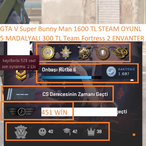 300 TL Team Fortress 2 ENVANTERLİ GTA V 1600 TL STEAM OYUN ENVANTERLİ STEAM LV 3 5 MADALYALI 6 LV