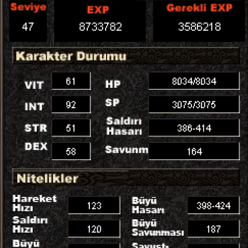 İTEMLER: +8 DOLUNAY 39 ORT 5 YARI 4 ŞEYTAN 4 HAYVAN +3 CANAVAR VE KRİTİK TAŞLI +6 YİN-YANG ZIRH MAX HP 2000 - 10 OK SAV- 3 SP 2 HP ABSORBE BÜYÜ DAYANIKLILIK 10- +3 HIZ +3 KORUMA TAŞLI +6 ALAYCI KASK HP ÜRETİMİ 8/ SP ÜRETİMİ 12/ ORK 20 /MİSTİK 10/ HAYVAN 4 +4 SYK SERSEMLİK - GÜÇ +8 / HAYVAN 6/ ŞEYTAN 4/ ORK 4 +4 ABANOZ KÜPE OK SAV 10/ EŞYA DÜŞÜRME ŞANSI 8 / HAYVAN 6 / ŞEYTAN 6/ ORK 6 4 EFSUN İNCİ KOLYE / 1500 HP EXP BONUS 6 / SP ÜRETİMİ 20 / BIÇAK SAV 4 +4 DEĞİŞMELİK 5 EFSUN KRİTAL BİLEZİK +4 DERİ ÇİZME 1500 HP KRİTİK 5 YELPAZE VE BIÇAK SAV 6 MAX SP +30 ÇARDA 10 M PARA MEVCUTTUR PAZARDA EDERİ FİYATLARA SATILAN 40 M LİK İTEMLER MEVCUT - 50 MADALYON 20 ZEN FASULYE 6 ADET +3 KORUNMA TAŞI +3 CANAVAR TAŞ 4 ADET DEĞERLİ TAŞ PARÇASI 2 ADET MAVİ İNCİ SKİL KAYBI YOKTUR SP FULLENMİŞTİR SONRASINDA SADECE HP VERİLMİŞTİR