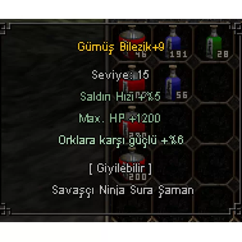 +9 GÜMÜŞ BİLEZİK (1200HP - ORK6) +4 SYK (4ZEKA 10YARI 8GÜÇ SERSEMLİK BAĞIŞIKLI)