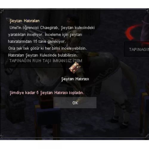 Şamanı ile verilecektir. Şaman kutsama M5, Ejder yardımı M5, 40 Level. 4 zekalı silah, +6 İnci kolye 3 zeka, +4 Beyaz Altın Küpesi 5 zeka var