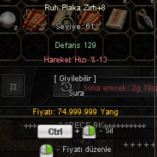 Hesabın içinde +8 RUH PLAKA ZIRH mevcuttur. Pazarında garanti satılacak 150m daha mevcttur. Kule ve kat başı farm itemleri. Deposunda +6 muholar +6 partiler ve daha bir çok kulelik eşyalar mevcuttur.