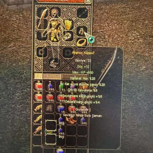DİĞER İTEMLER : +6 ALTIN KOLYE 1500 HP 10 KRİTİK +6 CENNET BİLEZİK 10 BÜYÜ 2000 HP +7 KORKU 15 BÜYÜ