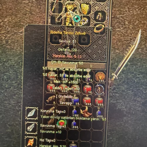 DİĞER İTEMLER : +6 ALTIN KOLYE 1500 HP 10 KRİTİK +6 CENNET BİLEZİK 10 BÜYÜ 2000 HP +7 KORKU 15 BÜYÜ