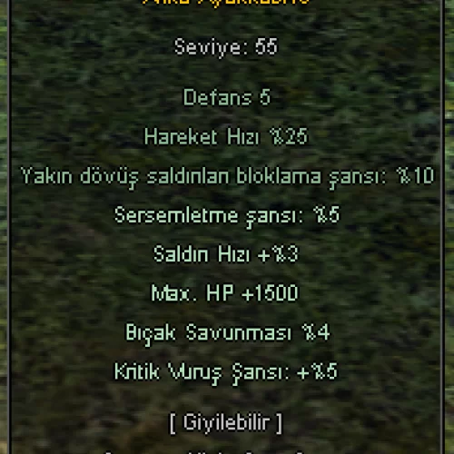 Sersemletme şansı: %5 Saldırı Hızı: +%3 Max. HP: +1500 Bıçak Savunması: %4 Kritik Vuruş Şansı: +%5