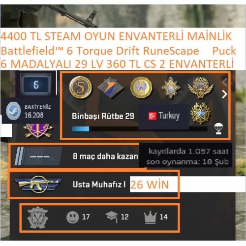 Battlefield 6 Torque Drift 4400 TL STEAM OYUN ENVANTERLİ STEAM LV 6 6 MADALYALI 29 LV 360 TL CS 2 ENVANTERLİ MADALAYA:2020 2021 2023 HİZMET MADALYASI 1 SEZON JETON 5 YIL JETON GLOBAL OFFİCE BADGE JETON WİN:REKABETCİ : WİN YOLDAŞ:26 WİN PRİME RANK :REKABETCİ:BELİRSİZ GÜVEN FAKTÖRÜ:YEŞİL CS GO SEVİYE:29 LV 2026 HİZMET MADALYASI ALICAK STEAM LV:6 LV STEAM PUAN:16.208 İSTEDİĞİNİZ HAREKETLİ ALINABİLİR STEAM BAKİYE: CS GO SAAT:1057 ENVANTER:360 TL MEVCUT İLK MAİL:ALDIM KİŞİNİN VERDİĞİ MAİL İLE TESLİM SAĞLANMAKTA KASA:6 ADET KASA MEVCUT ENVANTER DEĞERİNE DAHİLDİR HESAP STEAM GİRİŞ BİLGİLERİ VE MAİLİYLE TESLİM EDİLİCEKTİR HESAP MAİL DEĞİŞTİREBİLİR TELEFON EKLEYEBİLİR GUARD YAPABİLİRSİNİZ HESAP BAŞKA ERİŞİM HATASI ALIDIGI ZAMAN HESAP ALICI SORUMLUGU ALTINDADIR OYUNLAR :CS GO 2 PRİME Battlefield™ 6 Puck Finnish Cabin Mayhem Demo Torque Drift Apex Legends RuneScape Rubber Bandits: Christmas Prologue Grapples Galore İLAN YAYINDAYSA SORMADAN ALABİLİRSİNİZ 2-5 DK İÇİNDE TESLİM EDİYORUM BÜTÇENİZE GÖRE HER İLAN BULUNMAKTADIR DİĞER İLANLARIMA BAKMANIZI ÖNERİRİM