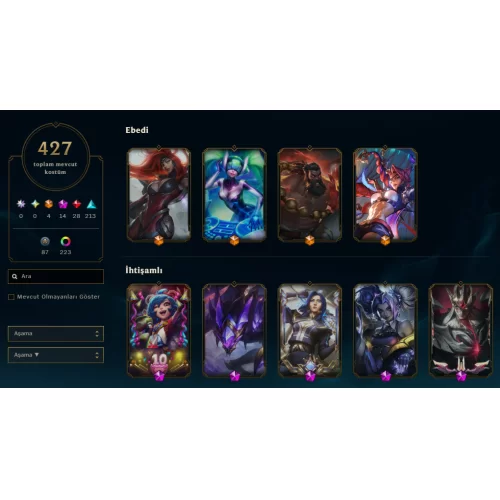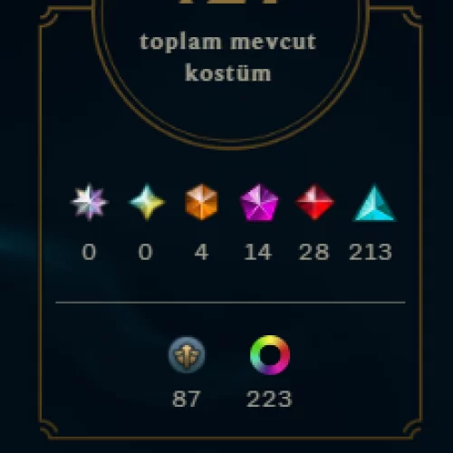 427 tane kostüm var özellikle adclerin çok iyi kostümleri var. İhtiyaçtan dolayı satıyorum hesabımı. 13 yıllık hesap tft tarafında da özel şeyler var.