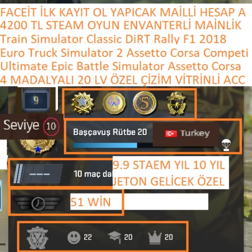 ETS 2 Train Simulator Classic Ultimate Epic Battle Simulator 4200 TL STEAM OYUN ENVANTERLİ STEAM LV 10 4 MADALYALI 20 LV MADALAYA:2017 HİZMET MADALYASI 5 YIL JETON GLOBAL OFFİCE BADGE JETON SADAKAT ROZETİ WİN:REKABETCİ : WİN YOLDAŞ:51 WİN PRİME RANK :REKABETCİ:BELİRSİZ GÜVEN FAKTÖRÜ:YEŞİL CS GO SEVİYE:20 LV 2026 HİZMET MADALYASI ALICAK STEAM LV:10 LV ÖZEL ÇİZİM MEVCUT ARKA PLAN MEVCUT STEAM YIL:9.9 YIL 10 YIL JETON GELİCEK STEAM PUAN: STEAM BAKİYE: CS GO SAAT:340 İLK MAİL:ALDIM KİŞİNİN VERDİĞİ MAİL İLE TESLİM SAĞLANMAKTA KASA: ADET KASA MEVCUT ENVANTER DEĞERİNE DAHİLDİR FACEİT ESEA KAYDI:FİNDER GÖRSEL 3 RESİMDE MEVCUT ENVANTER: TL MEVCUT OYUNLAR :CS GO 2 PRİME Train Simulator Classic Euro Truck Simulator 2 Assetto Corsa Ultimate Epic Battle Simulator Assetto Corsa Competizione F1 2018 Metro 2033 GRID 2 F1 2012 RaceRoom Racing Experience Project CARS F1 2015 DiRT Rally DiRT 3 Complete Edition HESAP STEAM GİRİŞ BİLGİLERİ VE MAİLİYLE TESLİM EDİLİCEKTİR HESAP BAŞKA ERİŞİM HATASI ALIDIGI ZAMAN HESAP ALICI SORUMLUGU ALTINDADIR İLAN YAYINDAYSA SORMADAN ALABİLİRSİNİZ 2-5 DK İÇİNDE TESLİM EDİYORUM BÜTÇENİZE GÖRE HER İLAN BULUNMAKTADIR DİĞER İLANLARIMA BAKMANIZI ÖNERİRİM
