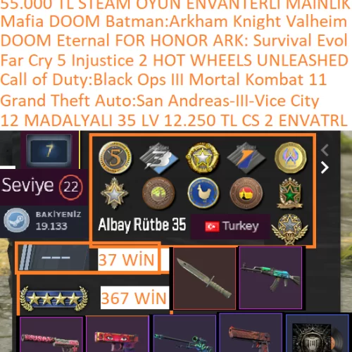 Far Cry 5 Injustice™ 2 Mortal Kombat 11 GTA SERİ 55.000 TL STEAM OYUN ENVANTERLİ STEAM LV 22 12 MADALYALI 35 LV KNİFE 12.250 TL CS 2 ENVANTERLİ MADALAYA:2022 ÇİFT 2021 2023 2025 HİZMET MADALYASI ANWERP OPRS JETN RİO OPRS JETON TAVUK JETON 1 SEZON JETON 3 SEZON JETON 5 YIL JETON GLOBAL OFFİCE BADGE JETON WİN:REKABETCİ :37 WİN YOLDAŞ:367 WİN PRİME RANK :REKABETCİ:BELİRSİZ GÜVEN FAKTÖRÜ:YEŞİL CS GO SEVİYE:35 LV 2026 HİZMET MADALYASI ALICAK STEAM LV:22 LV ÇİZİM EKLENEBİLİR 4 ADET HAREKETLİ ARKA PLAN ÇERÇEVE VE MİNİ PROFİLLİ STEAM PUAN:19.133 STEAM BAKİYE:20 CS GO SAAT:1.487 ENVANTER:12.250 TL MEVCUT MÜZİK KİTLİ KNİFELİ İLK MAİL:ALDIM KİŞİNİN VERDİĞİ MAİL İLE TESLİM SAĞLANMAKTA KASA:3 ADET KASA MEVCUT ENVANTER DEĞERİNE DAHİLDİR HESAP STEAM GİRİŞ BİLGİLERİ VE MAİLİYLE TESLİM EDİLİCEKTİR HESAP MAİL DEĞİŞTİREBİLİR TELEFON EKLEYEBİLİR GUARD YAPABİLİRSİNİZ HESAP BAŞKA ERİŞİM HATASI ALIDIGI ZAMAN HESAP ALICI SORUMLUGU ALTINDADIR OYUNLAR :CS GO 2 PRİME Call of Duty: Black Ops III Battlefield™ V Warhammer: Vermintide 2 Kiki Mortal Kombat 11 Injustice™ 2 Far Cry 5 HOT WHEELS UNLEASHED™ Grand Theft Auto: San Andreas - The Definitive Edition Grand Theft Auto: Vice City - The Definitive Edition Grand Theft Auto III - The Definitive Edition DOOM Eternal FOR HONOR The LEGO® NINJAGO® Movie Video Game Batman™: Arkham Knight ARK: Survival Evolved The Binding of Isaac: Rebirth Mafia House Flipper DOOM The Forest Call of Juarez Gunslinger Phasmophobia Castle Crashers Beholder Valheim Lethal Company People Playground Terraria Garry's Mod Portal 2 Left 4 Dead 2 Left 4 Dead Portal Half-Life Deathmatch: Source Day of Defeat: Source Half-Life: Source Counter-Strike: Source Half-Life 2 Counter-Strike: Condition Zero Need for Speed™ Heat Titanfall® 2 Wallpaper Engine Geometry Dash Half-Life: Blue Shift Ricochet Day of Defeat Deathmatch Classic Team Fortress Classic Content Warning İLAN YAYINDAYSA SORMADAN ALABİLİRSİNİZ 2-5 DK İÇİNDE TESLİM EDİYORUM BÜTÇENİZE GÖRE HER İLAN BULUNMAKTADIR DİĞER İLANLARIMA BAKMANIZI ÖNERİRİM