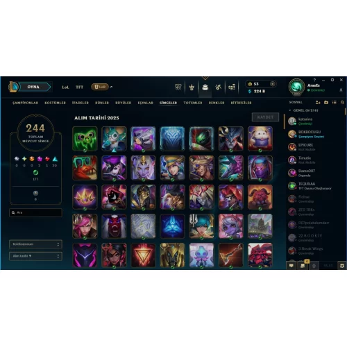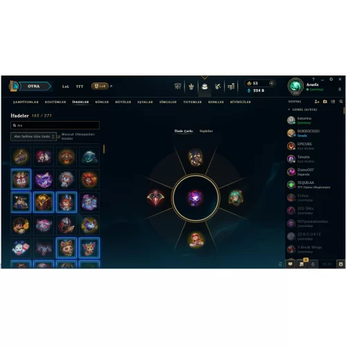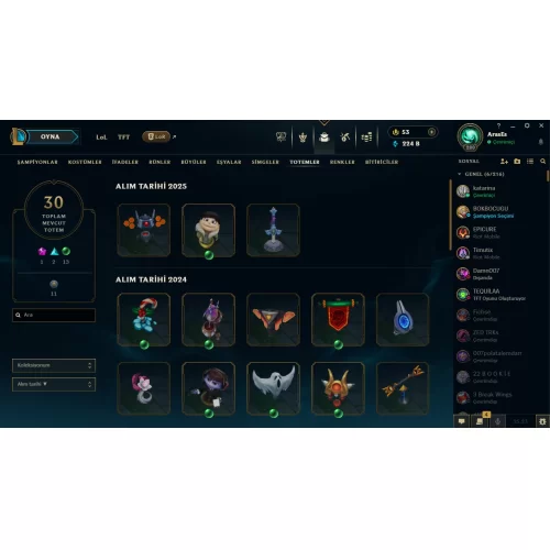 BÜTÜN ŞAMPİYONLAR MEVCUT 2011 YILINDAN BERİ AKTİF RESİMLER MEVUT PULCİFEİR EZREAL VAR. 229 KOSTÜM 15 RENK PAKETİ 30 TOTEM GÖRÜNÜMÜ VS.