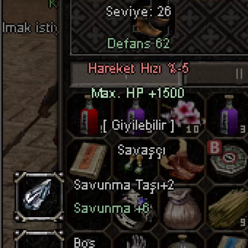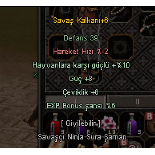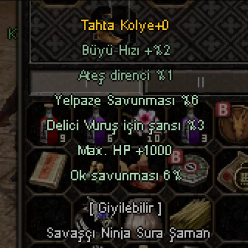 +4 1500 HP +2 SAV KURNAZ TAŞLI EJDER PLAKA +4 1K HP 5 ABSORBE 3 YARI 4 BÜYÜ YEŞİM TAŞI BİLEZİK +6 8 GÜÇ 6 ÇEVİKLİK 6 EXP 10 HAYVAN SAVAŞ KALKANI (+4 6 ORKLU SYK ALTERNATİFİ DE VAR) +0 1K HP 3 DELİCİ 6 OK 6 YELPAZE TAHTA KOLYE +5 10 ORK DEMİR KASK +4 10 ORK YEŞİM TAŞI KÜPE HAVADA SKİL KAYBI VAR M1 ÖFKEDE SKİL KAYBI YOK M1 2 SAAT 40 DK ÜÇÜNCÜ ELİ VAR PAZARINDA 3MLİK MALZEMESİYLE VERİLECEK