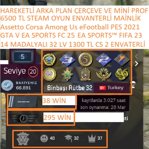 GTA V EA SPORTS FC 25-23 Assetto Corsa 6500 TL STEAM OYUN ENVANTERLİ STEAM LV 20 14 MADALYALI 32 LV 1300 TL CS 2 ENVANTERLİ MADALAYA:2025 3 KERE 2021 ÇİFT 2023 ÇİFT 2022 HİZMET MADALYASI ALTIN KIRIK DİŞ OPERASYON JETONU 1 SEZON JETON 2 SEZON JETON 3 SEZON JETON 5 YIL JETON GLOBAL OFFİCE BADGE JETON WİN:REKABETCİ :38 WİN YOLDAŞ:295 WİN PRİME RANK :REKABETCİ:BELİRSİZ GÜVEN FAKTÖRÜ:YEŞİL CS GO SEVİYE:32 LV 2026 HİZMETT MADALYASI ALICAK STEAM LV:20 LV 2 ADET ÇİZİM EKLENEBİLİR HAREKETLİ ARKA PLAN ÇERÇEVE VE MİNİ PROFİL STEAM PUAN:66.891 İSTEDİĞİNİZ ALABİLİRSİNİZ STEAM BAKİYE: CS GO SAAT:3027 CS 2 ENVANTER:1300 TL MEVCUT İLK MAİL:ALDIM KİŞİNİN VERDİĞİ MAİL İLE TESLİM SAĞLANMAKTA KASA: ADET KASA MEVCUT ENVANTER DEĞERİNE DAHİLDİR HESAP STEAM GİRİŞ BİLGİLERİ VE MAİLİYLE TESLİM EDİLİCEKTİR HESAP MAİL DEĞİŞTİREBİLİR TELEFON EKLEYEBİLİR GUARD YAPABİLİRSİNİZ HESAP BAŞKA ERİŞİM HATASI ALIDIGI ZAMAN HESAP ALICI SORUMLUGU ALTINDADIR OYUNLAR :CS GO 2 PRİME Grand Theft Auto V Legacy EA SPORTS FC 25 EA SPORTS™ FIFA 23 Assetto Corsa eFootball™ Among Us eFootball PES 2021 SEASON UPDATE İLAN YAYINDAYSA SORMADAN ALABİLİRSİNİZ 2-5 DK İÇİNDE TESLİM EDİYORUM BÜTÇENİZE GÖRE HER İLAN BULUNMAKTADIR DİĞER İLANLARIMA BAKMANIZI ÖNERİRİM