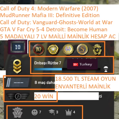 GTA V Far Cry 5-4 Call of Duty:Vanguard-Ghosts-World at War-(2007) 18.500 TL STEAM OYUN ENVANTERLİ STEAM LV 9 5 MADALYALI 7 LV MADALAYA:2025 HİZMET MADALYASI 10 YIL JETON 5 YIL JETON GLOBAL OFFİCE BADGE JETON SADAKAT ROZETİ WİN:REKABETCİ : WİN YOLDAŞ:20 WİN PRİME RANK :REKABETCİ:BELİRSİZ GÜVEN FAKTÖRÜ:YEŞİL CS GO SEVİYE:7 LV STEAM LV:9 LV STEAM PUAN: STEAM BAKİYE: CS GO SAAT:358 İLK MAİL:ALDIM KİŞİNİN VERDİĞİ MAİL İLE TESLİM SAĞLANMAKTA KASA: ADET KASA MEVCUT ENVANTER DEĞERİNE DAHİLDİR ENVANTER:15 TL MEVCUT OYUNLAR :CS GO 2 PRİME Far Cry 5 Detroit: Become Human Grand Theft Auto V Enhanced Call of Duty®: Vanguard Far Cry 4 Call of Duty: Ghosts Call of Duty: World at War MudRunner Call of Duty 4: Modern Warfare (2007) Mafia III: Definitive Edition Counter-Strike: Source Counter-Strike: Condition Zero Counter-Strike Total War: NAPOLEON - Definitive Edition Wallpaper Engine Outlast 2 Backseat Drivers Demo Dark Hours: Prologue FUCK HITLER One-armed cook Soundpad Demo PUBG: BATTLEGROUNDS FREE HESAP STEAM GİRİŞ BİLGİLERİ VE MAİLİYLE TESLİM EDİLİCEKTİR HESAP BAŞKA ERİŞİM HATASI ALIDIGI ZAMAN HESAP ALICI SORUMLUGU ALTINDADIR İLAN YAYINDAYSA SORMADAN ALABİLİRSİNİZ 2-5 DK İÇİNDE TESLİM EDİYORUM BÜTÇENİZE GÖRE HER İLAN BULUNMAKTADIR DİĞER İLANLARIMA BAKMANIZI ÖNERİRİM