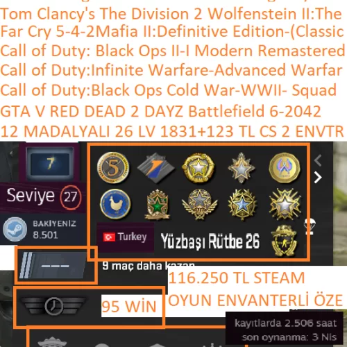GTA V RED DEAD 2 DAYZ Call of Duty SERİSİ Battlefield 6-2042 116.250 TL STEAM OYUN ENVANTERLİ STEAM LV 27 12 MADALYALI 26 LV 1831+123 TL CS 2 ENVTERLİ MADALAYA:2022 ÇİFT 2019 2020 2021 2023 2025 HİZMET MADALYASI 1 SEZON JETON TAVUK JETON 5 YIL JETON GLOBAL OFFİCE BADGE JETON SADAKAT ROZETİ WİN:REKABETCİ : WİN YOLDAŞ:95 WİN PRİME RANK :REKABETCİ:BELİRSİZ GÜVEN FAKTÖRÜ:YEŞİL CS GO SEVİYE:26 LV STEAM LV:27 LV ÇİZİM EKLENEBİLİR HAREKETLİ ARKA PLAN ÇERÇEVE VE MİNİ PROFİL STEAM PUAN:8501 STEAM BAKİYE:123 CS GO SAAT:2.506 ENVANTER:1831 TL MEVCUT İLK MAİL:ALDIM KİŞİNİN VERDİĞİ MAİL İLE TESLİM SAĞLANMAKTA KASA: ADET KASA MEVCUT ENVANTER DEĞERİNE DAHİLDİR HESAP STEAM GİRİŞ BİLGİLERİ VE MAİLİYLE TESLİM EDİLİCEKTİR HESAP MAİL DEĞİŞTİREBİLİR TELEFON EKLEYEBİLİR GUARD YAPABİLİRSİNİZ HESAP BAŞKA ERİŞİM HATASI ALIDIGI ZAMAN HESAP ALICI SORUMLUGU ALTINDADIR STEAM OYUN DEĞERİ: 116.250 TL 168 GAMES OYUNLAR :CS GO 2 PRİME GTA V DAYZ RED DEAD 2 Squad Battlefield™ 6 Need for Speed™ Heat Call of Duty®: Black Ops Cold War Battlefield™ 2042 Call of Duty: WWII Sniper Elite 4 Call of Duty: Infinite Warfare Call of Duty: Advanced Warfare Call of Duty: Black Ops II Far Cry 5 Call of Duty: Modern Warfare Remastered (2017) Call of Duty: Black Ops Need for Speed™ Hot Pursuit Remastered Mafia II: Definitive Edition The Witcher 3: Wild Hunt Mafia II (Classic) Tom Clancy's The Division 2 Wolfenstein II: The New Colossus Far Cry 4 Insurgency: Sandstorm 7 Days to Die Need for Speed™ Most Wanted Max Payne 3 Medal of Honor(TM) Single Player Mirror's Edge Grand Theft Auto IV: The Complete Edition Tom Clancy's Splinter Cell Blacklist Far Cry® 3 Dead Island Riptide Definitive Edition Dead Island Definitive Edition Mafia The Witcher 2: Assassins of Kings Enhanced Edition BeamNG.drive S.T.A.L.K.E.R.: Call of Prypiat - Enhanced Edition S.T.A.L.K.E.R.: Clear Sky - Enhanced Edition S.T.A.L.K.E.R.: Shadow of Chornobyl - Enhanced Edition Wolfenstein: Youngblood Wolfenstein: The Old Blood Wolfenstein: The New Order The Elder Scrolls V: Skyrim S.T.A.L.K.E.R.: Call of Pripyat S.T.A.L.K.E.R.: Clear Sky S.T.A.L.K.E.R.: Shadow of Chernobyl Toy Story 3 Enemy Front Assetto Corsa The Forest Hitman: Absolution Thief Simulator Quarantine Zone: The Last Check PAYDAY 2 Max Payne 2: The Fall of Max Payne ARK: Survival Evolved Demolish & Build 2018 Far Cry 2 Tom Clancy's Rainbow Six 3: Gold Edition Tom Clancy's Rainbow Six: Vegas 2 Tom Clancy's Rainbow Six: Lockdown Tom Clancy's Rainbow Six: Vegas Far Cry The Witcher: Enhanced Edition FlatOut 2 People Playground Ryse: Son of Rome POSTAL 2 Hitman: Blood Money Left 4 Dead 2 Left 4 Dead Half-Life Deathmatch: Source Day of Defeat: Source Counter-Strike: Source R.E.P.O. Car For Sale Simulator 2023 Black Desert Battle vs Chess Hard Truck Apocalypse / Ex Machina Dead Island Retro Revenge Dying Light Hard Truck: Apocalypse Rise Of Clans / Ex Machina: Meridian 113 Age of History II Company of Heroes 2 Earth 2160 Kao the Kangaroo: Round 2 Drunken Wrestlers 2 Call of Juarez Gunslinger Saints Row: The Third Tomb Raider Call of Juarez: Bound in Blood Call of Juarez Crash Time 2 Blood and Bacon Reflex Soccer Online: Ball 3D Xpand Rally Xtreme Sniper Ghost Warrior 2 Sniper: Ghost Warrior ShipLord EA SPORTS FC™ 24 EA SPORTS™ FIFA 23 FIFA 22 EA SPORTS™ FIFA 21 Modern Combat 5 İLAN YAYINDAYSA SORMADAN ALABİLİRSİNİZ 2-5 DK İÇİNDE TESLİM EDİYORUM BÜTÇENİZE GÖRE HER İLAN BULUNMAKTADIR DİĞER İLANLARIMA BAKMANIZI ÖNERİRİM