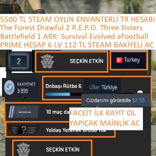 TR HESABI Battlefield 1 ARK: Survival Evolved R.E.P.O. 5500 TL STEAM OYUN ENVANTERLİ STEAM LV 2 PRİME HESAP 6 LV MADALAYA:PRİME SEÇKİN HESAP 6 LV WİN:REKABETCİ : WİN YOLDAŞ: WİN PRİME RANK :REKABETCİ:BELİRSİZ GÜVEN FAKTÖRÜ:YEŞİL CS GO SEVİYE:6 LV STEAM ÜLKE:TÜRKİYE TR STEAM LV:2 LV STEAM PUAN:3.899 STEAM BAKİYE:112 TL CS GO SAAT:51 ENVANTER: TL MEVCUT İLK MAİL:ALDIM KİŞİNİN VERDİĞİ MAİL İLE TESLİM SAĞLANMAKTA KASA: ADET KASA MEVCUT ENVANTER DEĞERİNE DAHİLDİR FACEİT ESEA KAYDI:FİNDER GÖRSEL 3 RESİMDE MEVCUT HESAP STEAM GİRİŞ BİLGİLERİ VE MAİLİYLE TESLİM EDİLİCEKTİR HESAP MAİL DEĞİŞTİREBİLİR TELEFON EKLEYEBİLİR GUARD YAPABİLİRSİNİZ HESAP BAŞKA ERİŞİM HATASI ALIDIGI ZAMAN HESAP ALICI SORUMLUGU ALTINDADIR OYUNLAR :CS GO 2 PRİME Battlefield™ 1 ARK: Survival Evolved The Forest Unturned Drawful 2 PUBG: BATTLEGROUNDS FREE Toy Tinker Simulator eFootball™ R.E.P.O. Three Sisters Gamer Stop Simulator : Prologue Motorbike Evolution 2024 The Jackbox Megapicker İLAN YAYINDAYSA SORMADAN ALABİLİRSİNİZ 2-5 DK İÇİNDE TESLİM EDİYORUM BÜTÇENİZE GÖRE HER İLAN BULUNMAKTADIR DİĞER İLANLARIMA BAKMANIZI ÖNERİRİM